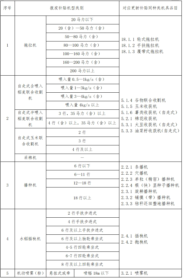 各地在推进农机报废更新工作中,对省农业农村厅 省发展改革委 省财政厅联合印发的《甘肃省老旧农业机械报废更新专项行动方案》(甘设专责农机发〔2024〕16号)部分政策要求理解把握不准,根据《农业农村部办公厅 财政部办公厅关于加大工作力度持续实施好农业机械报废更新补贴政策的通知》(农办机〔2024〕4号)和《农业农村部办公厅 国家发展改革委办公厅 财政部办公厅关于加大工作力度持续实施好农业机械报废更新补贴政策的补充通知》(农办机〔2024〕5号)相关要求,现将有关政策解释如下。对照《2024-2026年甘肃省农机购置与应用补贴机具种类范围》,将报废补贴15个机具种类及更新补贴同种类机具品目进行了对应,形成甘肃省农机报废机型类别及更新补贴同种类机具品目对应表。
